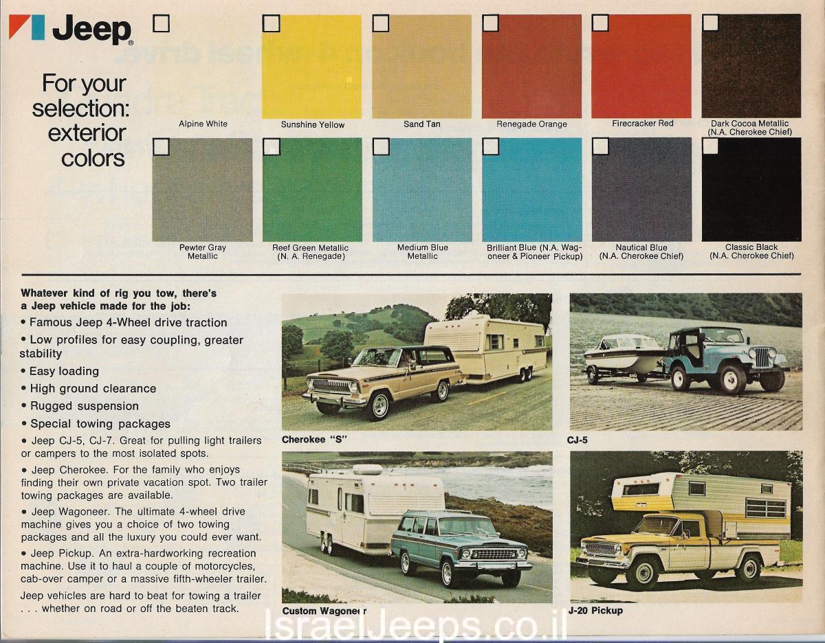 ג'יפ ייצרו דגמים וחבילות מיוחדות במהלך השנים כמו רנגייד, לרדו, גולדן-איגל ג'מבורי, הונצ'ו ועוד.. לשיחזור המראה הנכון וחתימת שיפוץ הג'יפ בדוק את המפרט במפענח מספר הזיהוי שלנו,לאחר מכן תוכל לעיין בקטלוג הצבעים ולבסוף אם ברשותך חבילה מיוחדת תוכל לבחור את קיט המדבקות שעיטר את הג'יפ שלך כשירד מפס הייצור לפני כמה עשורים.. השילובים של ג'יפ בשנות השבעים והשמונים הקדימו את זמנם לכל הדעות וכיום הם מבוקשים מתמיד! מקווים שעזרנו לך לקבל החלטה לשחזר למקור.
